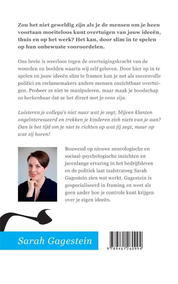 Bouwend op nieuwe neurologische en sociaal-psychologische inzichten en jarenlange ervaring in het bedrijfsleven en de politiek laat taalstrateeg Sarah Gagestein zien wat werkt. Gagestein is gespecialiseerd in framing en weet als geen ander hoe u controle kunt krijgen over uw eigen ideeën.