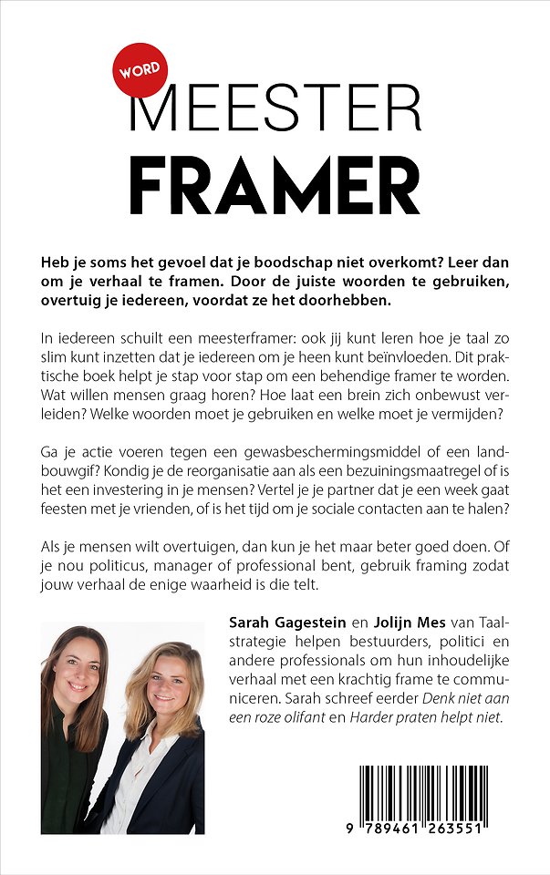 Meesterframer - De complete handleiding framing Sarah Gagestein 25 november 2019 Framing? Dat is iets wat politici doen, toch? Klopt. Maar ook jij framet. Elke dag. En als je dat nou op de juiste manier doet, kan ook jij er veel overtuigingskracht mee winnen. Weten hoe? Lees dan het nieuwe boek: Meesterframer, van Sarah Gagestein en Jolijn Mes. Een preview. Lees het volledige artikel