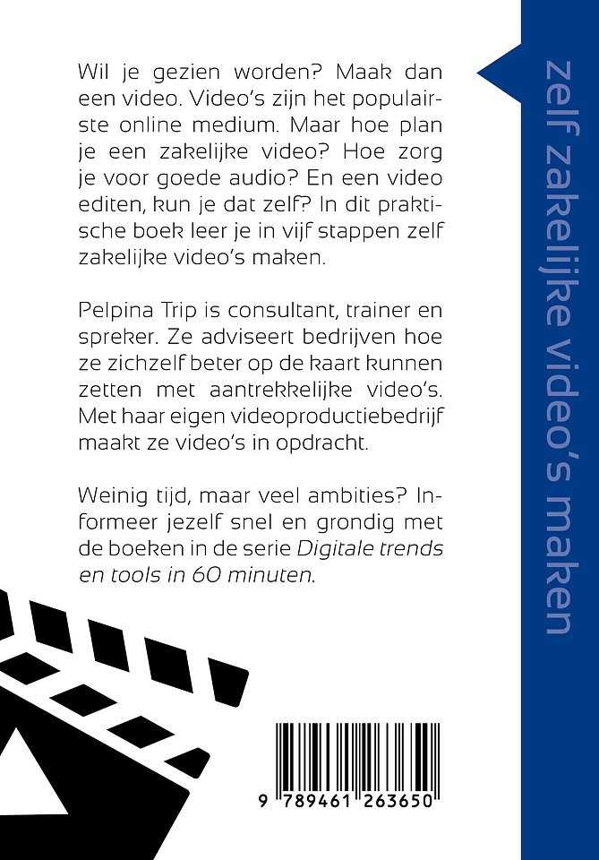 Meer over Pelpina TripWil je gezien worden? Maak dan een video. Video's zijn het populairste online medium. Maar hoe plan je een zakelijke video? Hoe zorg je voor goede audio? En een video editen, kun je dat zelf? In dit praktische boek leer je in vijf stappen zelf zakelijke video's maken.