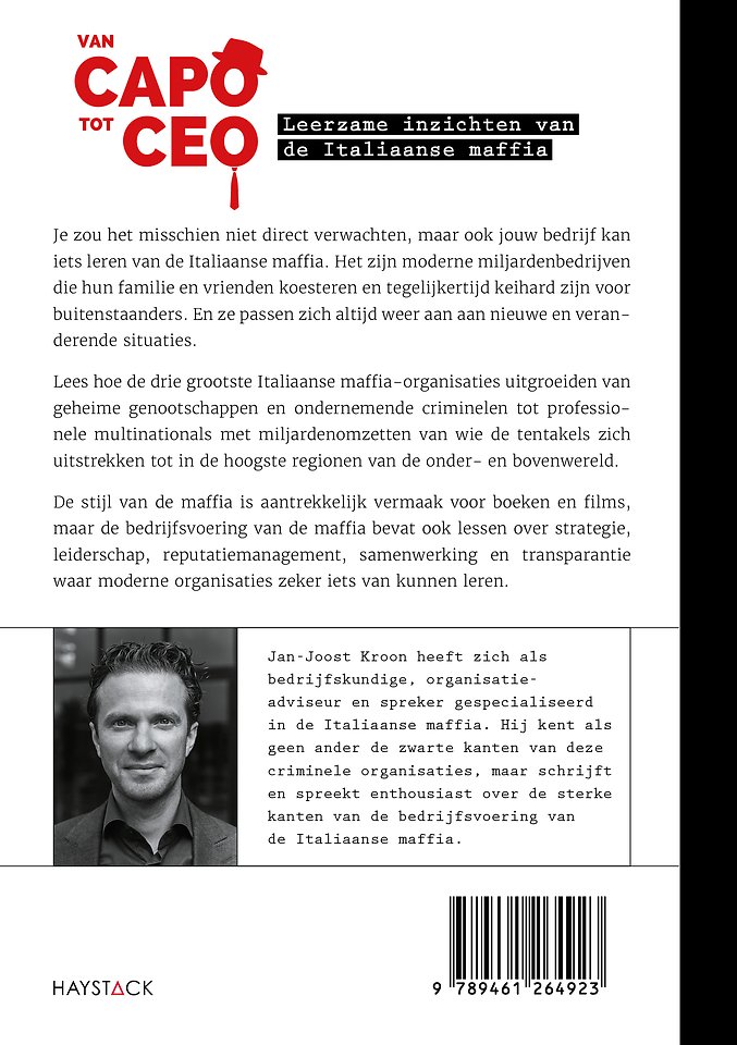 Jan-Joost Kroon heeft zich als bedrijfskundige, organisatieadviseur en spreker gespecialiseerd in de Italiaanse maffia. Hij kent als geen ander de zwarte kanten van deze criminele organisaties, maar schrijft en spreekt enthousiast over sterke kanten van de bedrijfsvoering van de Italiaanse maffia.