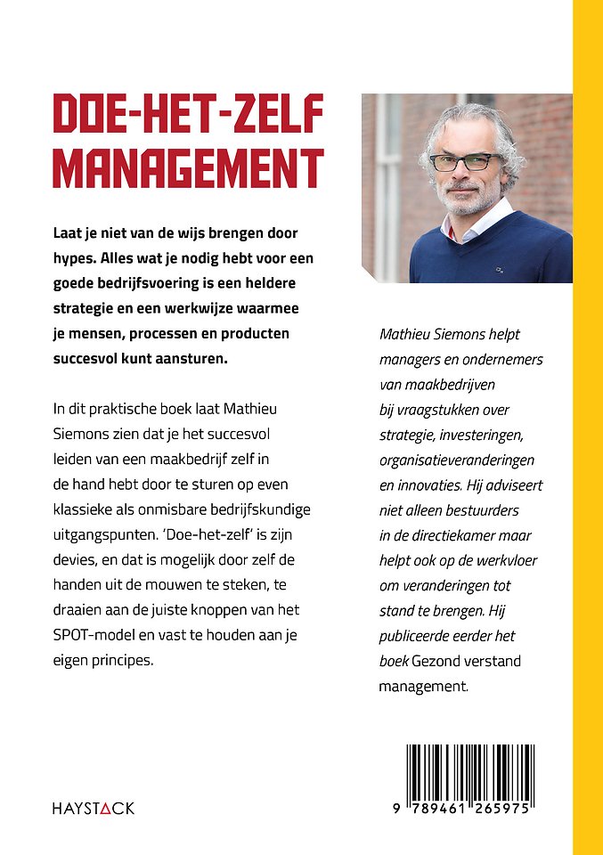 In dit praktische boek laat Mathieu Siemons zien dat je het succesvol leiden van een maakbedrijf zelf in de hand hebt door te sturen op even klassieke als onmisbare bedrijfskundige uitgangspunten. ‘Doe-het-zelf’ is zijn devies, en dat is mogelijk door zelf de handen uit de mouwen te steken, te draaien aan de juiste knoppen van het SPOT-model© en vast te houden aan je eigen principes.