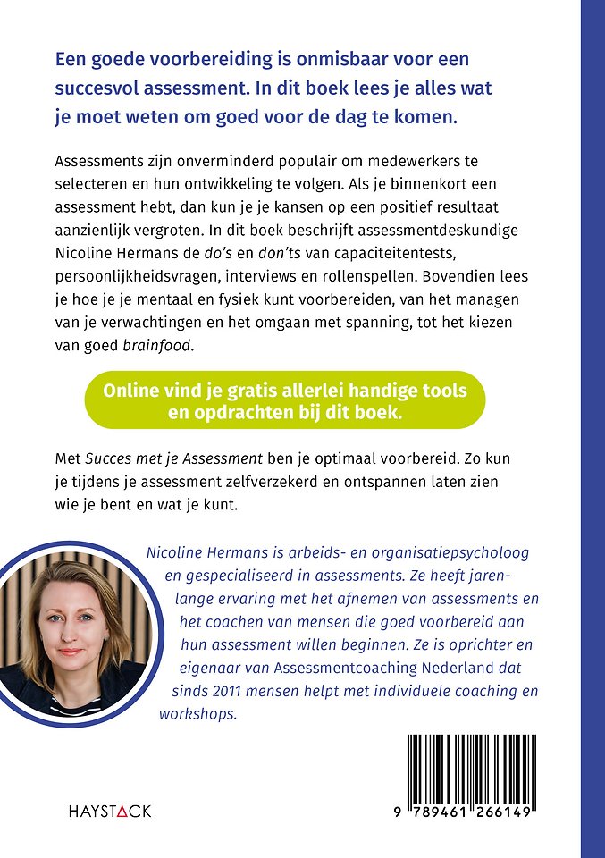 Assessments zijn onverminderd populair om medewerkers te selecteren en hun ontwikkeling te volgen. Als je binnenkort een assessment hebt, dan kun je je kansen op een positief resultaat aanzienlijk vergroten. In dit boek beschrijft assessmentdeskundige Nicoline Hermans de do's en don'ts van capaciteitentests, persoonlijkheidsvragen, interviews en rollenspellen. Bovendien lees je hoe je je mentaal en fysiek kunt voorbereiden, van het managen van je verwachtingen en het omgaan met spanning, tot het kiezen van goed brainfood.