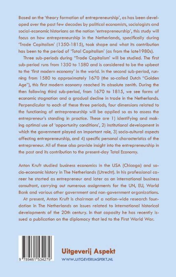 Based on the 'theory formation of entrepreneurship', as has been developed over the past few decades by political economists, sociologists and social-economic historians on the notion 'entrepreneurship', this study will focus on how entrepreneurship in the Netherlands, specifi cally during 'Trade Capitalism' (1350-1815), took shape and what its contribution has been to the period of 'Total Capitalism' (as from the late1980s).