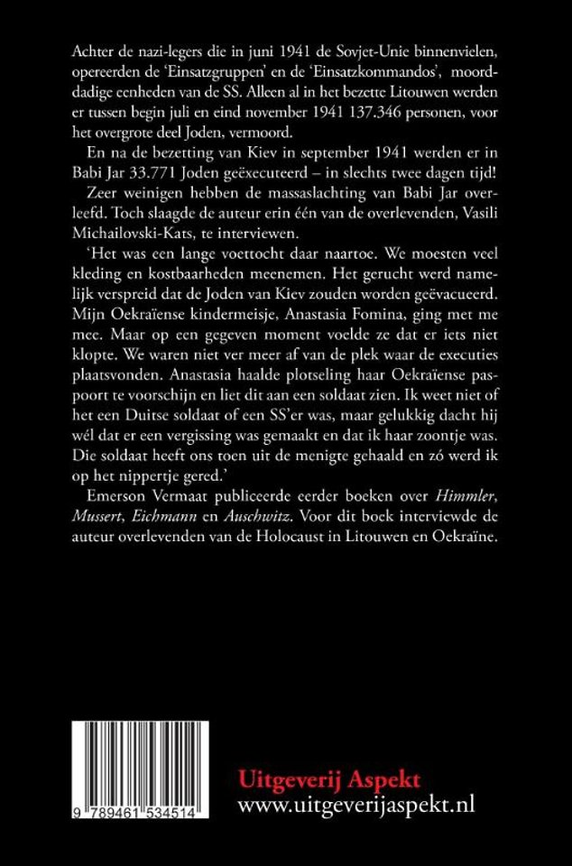 Zeer weinigen hebben de massaslachting van Babi Jar overleefd. Toch slaagde de auteur erin een van de overlevenden, Vasili Michailovski-Kats, te interviewen: