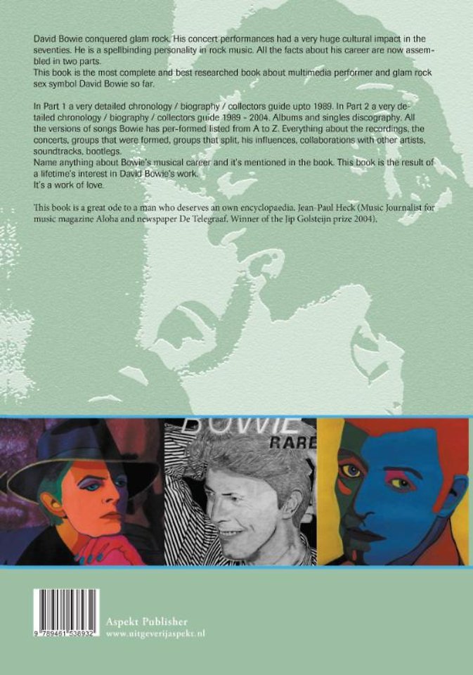 In Part 1 a very detailed chronology / biography / collectors guide upto 1989. In Part 2 a very detailed chronology / biography / collectors guide 1989 - 2004. Albums and singles discography. All the versions of songs Bowie has performed listed from A to Z. Everything about the recordings, the concerts, groups that were formed, groups that split, his influences, collaborations with other artists, soundtracks and bootlegs.