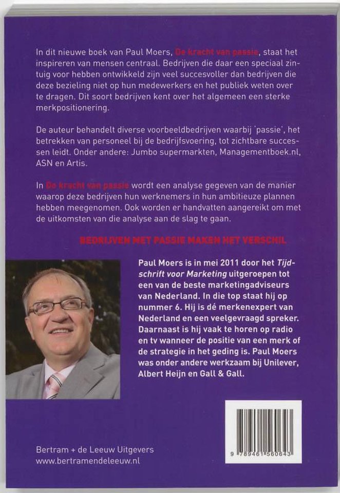 Meer over Paul MoersIn het nieuwe boek van Paul Moers, 'De kracht van passie', staat het inspireren van mensen centraal. Bedrijven die daar een speciaal zintuig voor hebben ontwikkeld zijn veel succesvoller dan bedrijven die deze bezieling niet op hun medewerkers en het publiek weten over te dragen. Dit soort bedrijven kent over het algemeen een sterke merkpositionering.