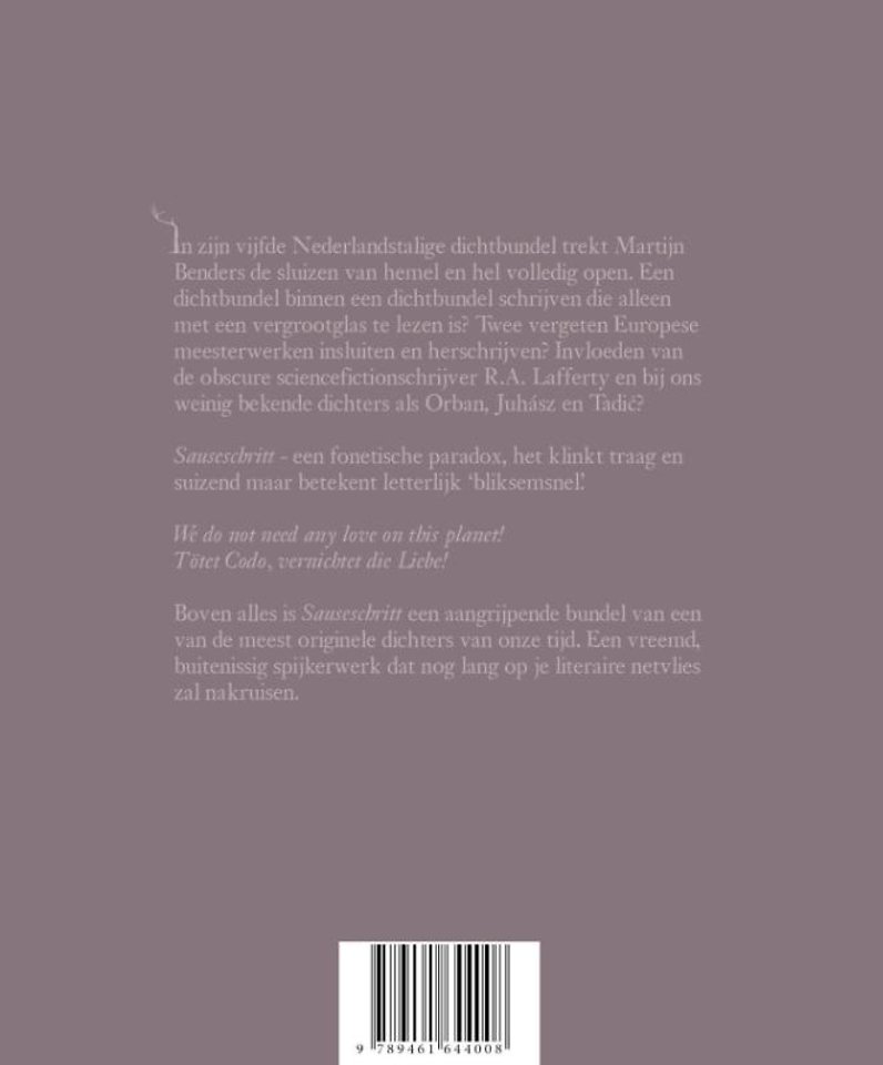 Boven alles is SAUSESCHRITT een aangrijpende bundel van een van de meest originele dichters van onze tijd. Een vreemd, buitenissig spijkerwerk dat nog lang op je literaire netvlies zal nakruisen.