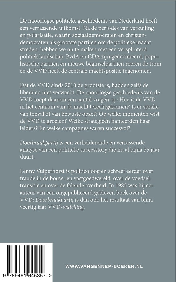 Lenny Vulperhorst is politicoloog en schreef eerder over fraude in de bouw- en vastgoedwereld, over de voedseltransitie en over de falende overheid. In 1985 was hij co-auteur van een ongepubliceerd gebleven boek over de VVD: Doorbraakpartij is dan ook het resultaat van bijna veertig jaar VVD-watching.