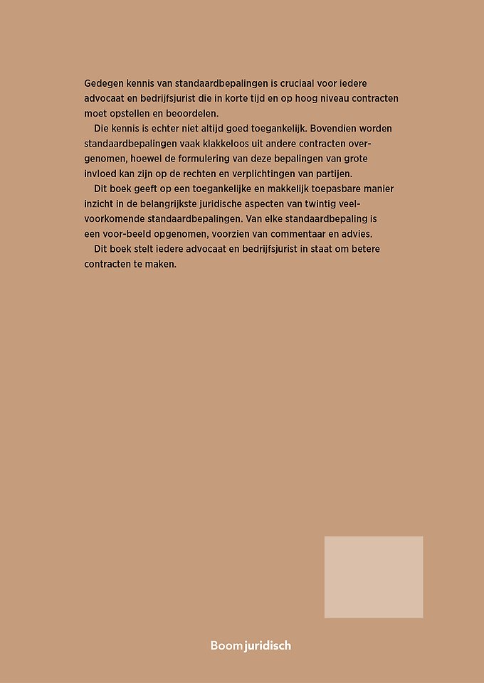 Dit boek geeft op een toegankelijke en makkelijk toepasbare manier inzicht in de belangrijkste juridische aspecten van twintig veelvoorkomende standaardbepalingen. Van elke standaardbepaling is een voorbeeld opgenomen, voorzien van commentaar en advies.