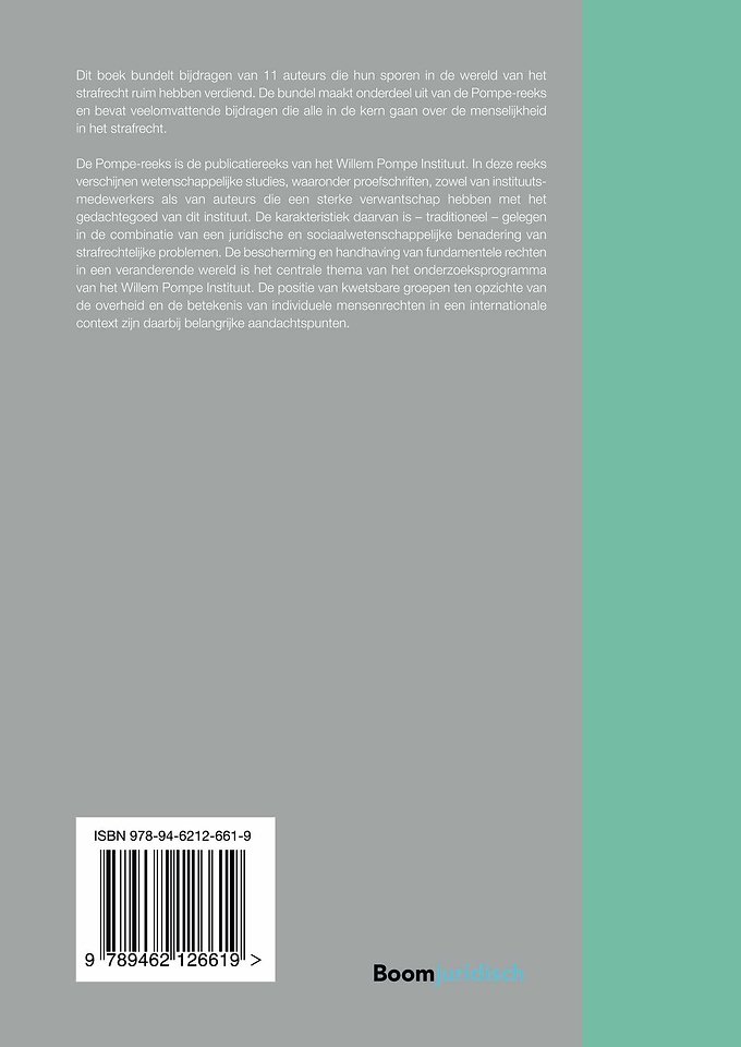 Dit boek bundelt bijdragen van 11 auteurs die hun sporen in de wereld van het strafrecht ruim hebben verdiend. De bundel maakt onderdeel uit van de Pompe-reeks en bevat veelomvattende bijdragen die alle in de kern gaan over de menselijkheid in het strafrecht.