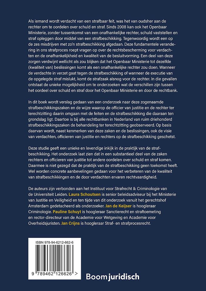 In dit boek wordt verslag gedaan van een onderzoek naar deze zogenaamde strafbeschikkingszaken en de wijze waarop de officier van justitie en de rechter ter terechtzitting daarin omgaan met de feiten en de strafbeschikking die daaraan ten grondslag ligt. Daartoe is bij alle rechtbanken in Nederland van ruim driehonderd strafbeschikkingszaken de behandeling ter terechtzitting geobserveerd. Op basis daarvan wordt, naast kenmerken van deze zaken en de beslissingen, ook de visie van verdachten, officieren van justitie en rechters op de strafbeschikking geschetst.