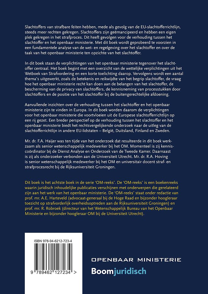 Slachtoffers van strafbare feiten hebben, mede als gevolg van de EU-slachtofferrichtlijn, steeds meer rechten gekregen. Slachtoffers zijn geëmancipeerd en hebben een eigen plek gekregen in het strafproces. Dit heeft gevolgen voor de verhouding tussen het slachtoffer en het openbaar ministerie. Met dit boek wordt geprobeerd te voorzien in een fundamentele analyse van de wet- en regelgeving over het slachtoffer en over de taak van het openbaar ministerie ten opzichte van het slachtoffer.