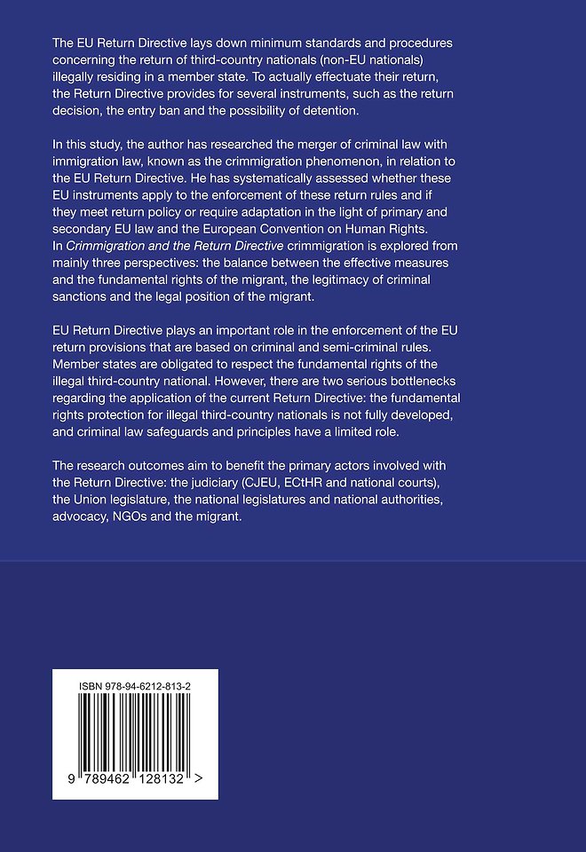 In this study, the author has researched the merger of criminal law with immigration law, known as the crimmigration phenomenon, in relation to the EU Return Directive. He has systematically assessed whether these EU instruments apply to the enforcement of these return rules and if they meet return policy or require adaptation in the light of primary and secondary EU law and the European Convention on Human Rights. In Crimmigration and the Return Directive crimmigration is explored from mainly three perspectives: the balance between the effective measures and the fundamental rights of the migrant, the legitimacy of criminal sanctions and the legal position of the migrant.