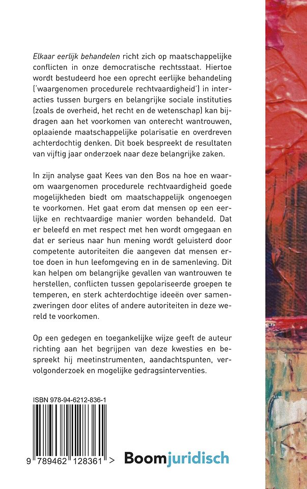 Elkaar eerlijk behandelen richt zich op maatschappelijke conflicten in onze democratische rechtsstaat. Hiertoe wordt bestudeerd hoe een oprecht eerlijke behandeling (‘waargenomen procedurele rechtvaardigheid’) in interacties tussen burgers en belangrijke sociale instituties (zoals de overheid, het recht en de wetenschap) kan bijdragen aan het voorkomen van onterecht wantrouwen, oplaaiende maatschappelijke polarisatie en overdreven achterdochtig denken. Dit boek bespreekt de resultaten van vijftig jaar onderzoek naar deze belangrijke zaken.