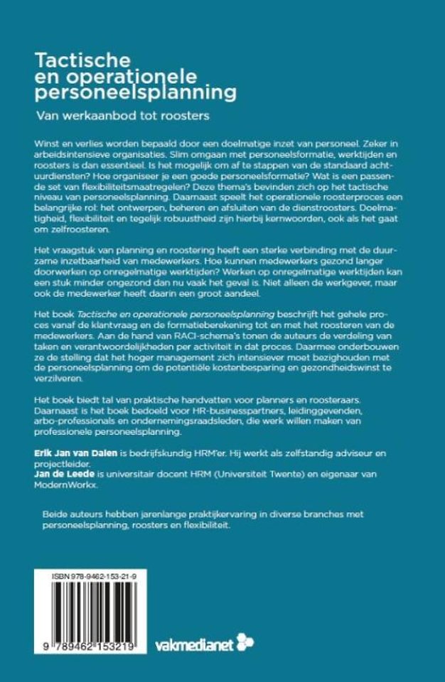 Het boek 'Tactische en operationele personeelsplanning' beschrijft het gehele proces vanaf de klantvraag en de formatieberekening tot en met het roosteren van de medewerkers. Aan de hand van RACI-schema's tonen de auteurs de verdeling van taken en verantwoordelijkheden per activiteit in dat proces. Daarmee onderbouwen ze de stelling dat het hoger management zich intensiever moet bezighouden met de personeelsplanning om de potentiële kostenbesparing en gezondheidswinst te verzilveren.