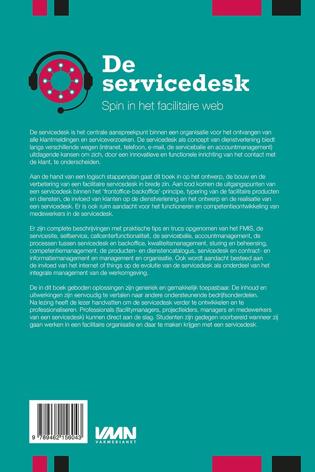 Aan de hand van een logisch stappenplan gaat dit boek in op het ontwerp, de bouw en de verbetering van een facilitaire servicedesk in brede zin. Aan bod komen de uitgangspunten van een servicedesk binnen het ‘frontoffice-backoffice’-principe, typering van de facilitaire producten en diensten, de invloed van klanten op de dienstverlening en het ontwerp en de realisatie van een servicedesk. Er is ook ruim aandacht voor het functioneren en competentieontwikkeling van medewerkers in de servicedesk.