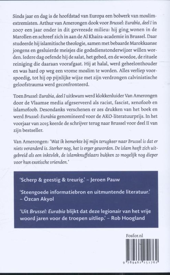 Sinds jaar en dag is de hoofdstad van Europa een bolwerk van moslimextremisten. Arthur van Amerongen dook voor Brussel: Eurabia, deel I in 2007 een jaar onder in dit gevreesde milieu: hij ging wonen in de Marollen en schreef zich in aan de Al Khaira-academie in Brussel. Daar studeerde hij islamitische theologie. Iedere dag oefende hij de salat, het gebed, en de woedoe, de rituele reiniging die daaraan voorafgaat. Hij at halal, werd geheelonthouder en was hard op weg een vrome moslim te worden. Alles verliep voorspoedig, tot hij op pijnlijke wijze met zijn verdrongen calvinistische geloofstrauma werd geconfronteerd.