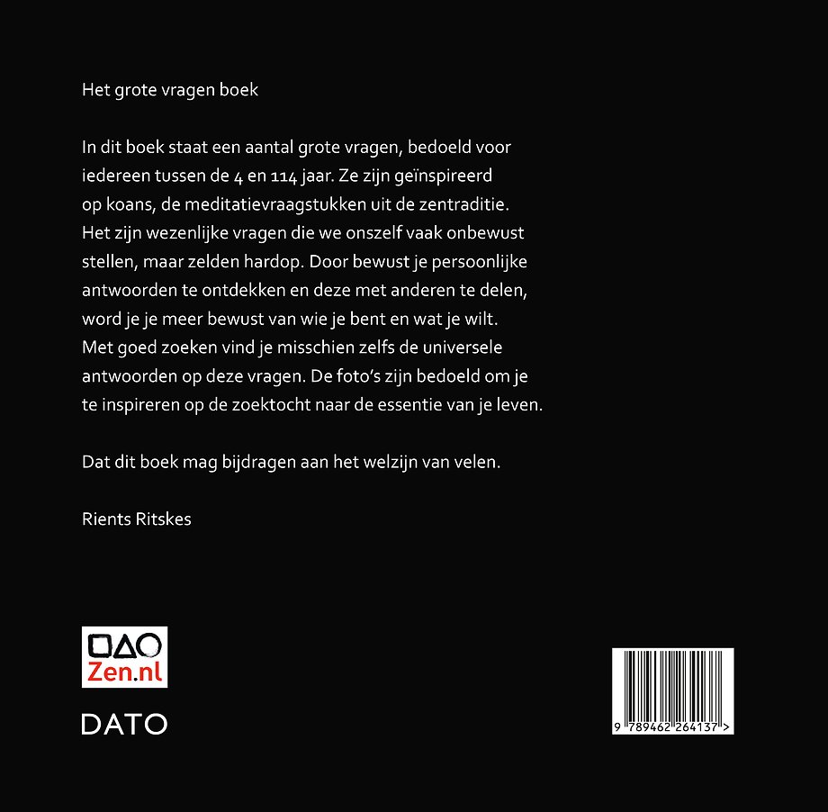 In dit boek staat een aantal grote vragen, bedoeld voor iedereen tussen de 4 en 114 jaar. Ze zijn geïnspireerd op koans, de meditatievraagstukken uit de zentraditie. Het zijn wezenlijke vragen die we onszelf vaak onbewust stellen, maar zelden hardop. Door bewust je persoonlijke antwoorden te ontdekken en deze met anderen te delen, word je je meer bewust van wie je bent en wat je wilt. Met goed zoeken vind je misschien zelfs de universele antwoorden op deze vragen. De foto’s zijn bedoeld om je te inspireren op de zoektocht naar de essentie van je leven.