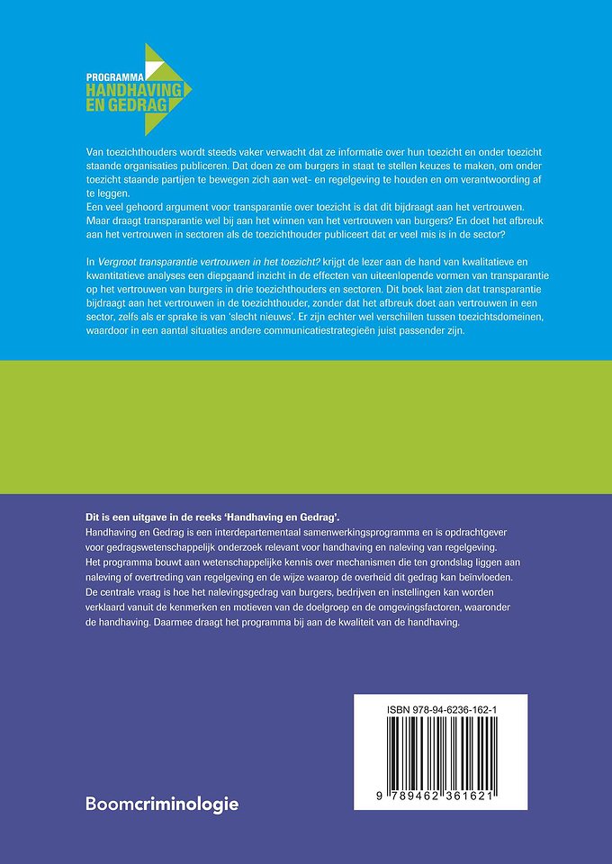 In Vergroot transparantie vertrouwen in het toezicht? krijgt de lezer aan de hand van kwalitatieve en kwantitatieve analyses een diepgaand inzicht in de effecten van uiteenlopende vormen van transparantie op het vertrouwen van burgers in drie toezichthouders en sectoren. Dit boek laat zien dat transparantie bijdraagt aan het vertrouwen in de toezichthouder, zonder dat het afbreuk doet aan vertrouwen in een sector, zelfs als er sprake is van ‘slecht nieuws’. Er zijn echter wel verschillen tussen toezichtsdomeinen, waardoor in een aantal situaties andere communicatiestrategieën juist passender zijn.