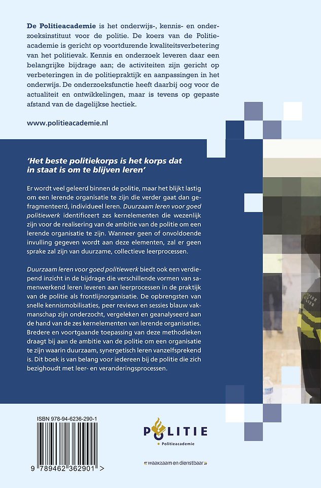 Er wordt veel geleerd binnen de politie, maar het blijkt lastig om een lerende organisatie te zijn die verder gaat dan gefragmenteerd, individueel leren. Duurzaam leren voor goed politiewerk identificeert zes kernelementen die wezenlijk zijn voor de realisering van de ambitie van de politie om een lerende organisatie te zijn. Wanneer geen of onvoldoende invulling gegeven wordt aan deze elementen, zal er geen sprake zal zijn van duurzame, collectieve leerprocessen.
