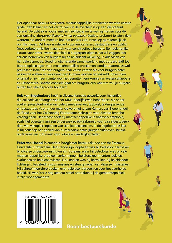 Burgerparticipatie in het openbaar bestuur probeert te laten zien waarom het anders moet en hoe het anders kan, zowel op gemeentelijk als op rijksniveau. Dit boek is relevant voor ambtenaren, bestuurders en politici (met verbeterambitie), maar ook voor constructieve burgers. Een belangrijke sleutel voor beter overheidsbeleid is burgerparticipatie, dat wil zeggen: het serieus betrekken van burgers bij de beleidsontwikkeling, in alle fasen van het beleidsproces. Goed functionerende samenwerking met burgers leidt tot betere oplossingen voor maatschappelijke problemen, omdat daarmee zowel praktische inzichten van burgers naar voren komen als voor burgers beter passende wetten en voorzieningen kunnen worden ontwikkeld. Bovendien ontstaat er zo meer ruimte voor het benutten van kennis van wetenschappers en uitvoerders. Overheidsbeleid gaat om burgers, dus waarom zou je burgers buiten het beleidsproces houden?