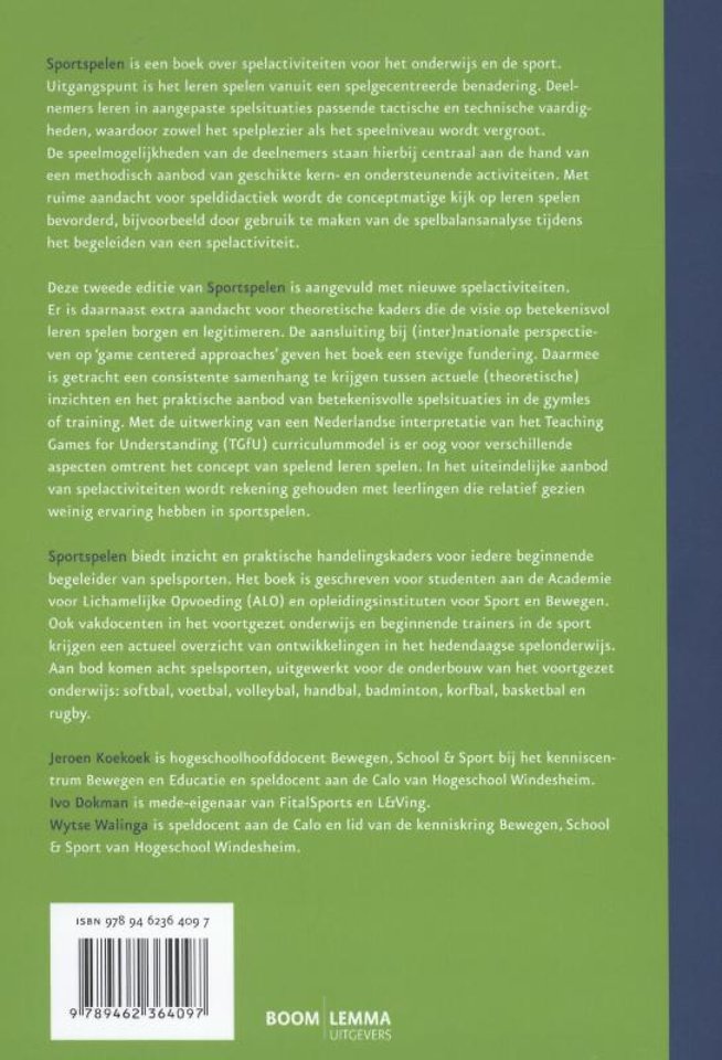Sportspelen biedt inzicht en praktische handelingskaders voor iedere beginnende begeleider van spelsporten. Het boek is geschreven voor studenten aan de Academie voor Lichamelijke Opvoeding (ALO) en opleidingsinstituten voor Sport en Bewegen. Ook vakdocenten in het voortgezet onderwijs en beginnende trainers in de sport krijgen een actueel overzicht van ontwikkelingen in het hedendaagse spelonderwijs. Aan bod komen acht spelsporten, uitgewerkt voor de onderbouw van het voortgezet onderwijs: softbal, voetbal, volleybal, handbal, badminton, korfbal, basketbal en rugby.