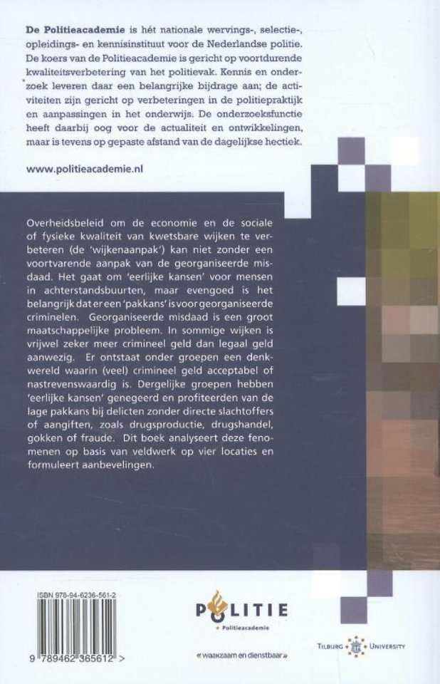 Georganiseerde misdaad is een groot maatschappelijke probleem. In sommige wijken is vrijwel zeker meer crimineel geld dan legaal geld aanwezig. Er ontstaat onder groepen een denkwereld waarin (veel) crimineel geld acceptabel of nastrevenswaardig is. Dergelijke groepen hebben 'eerlijke kansen' genegeerd en profiteerden van de lage pakkans bij delicten zonder directe slachtoffers of aangiften, zoals drugsproductie, drugshandel, gokken of fraude. Dit boek analyseert deze fenomenen op basis van veldwerk op vier locaties en formuleert aanbevelingen.