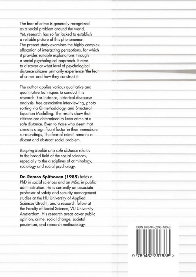 This research utilized a broad range of both qualitative and quantitative techniques, such as historical discourse analysis, free associative interviewing, sorting of photo’s through Q-methodology and Structural Equation Modelling. The results show that citizens are highly motivated to keep the trouble of crime at a safe distance. Even to those who assess crime to be a highly significant risk outside one’s own front door, ‘the fear of crime’ is a distant and abstract social problem.