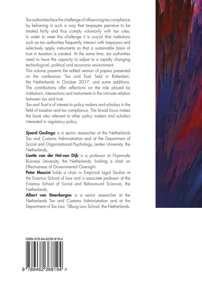 This volume presents the edited version of papers presented on the conference ‘Tax and Trust’ held in Rotterdam, the Netherlands in October 2017, and some additions. The contributions offer reflections on the role played by institutions, interactions and instruments in the intricate relation between tax and trust.