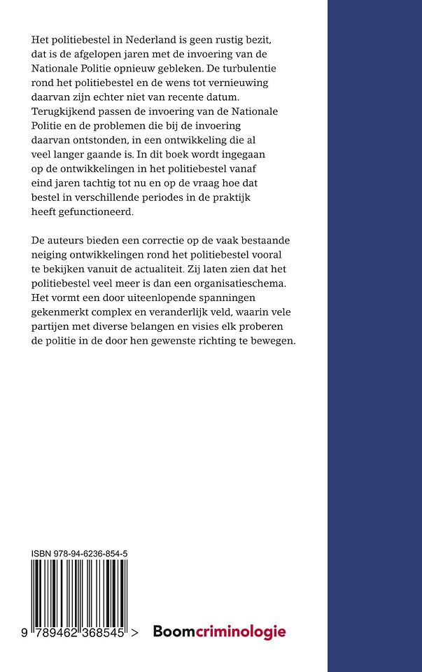 Het politiebestel in Nederland is geen rustig bezit, dat is de afgelopen jaren met de invoering van de Nationale Politie opnieuw gebleken. De turbulentie rond het politiebestel en de wens tot vernieuwing daarvan zijn echter niet van recente datum. Terugkijkend passen de invoering van de Nationale Politie en de problemen die bij de invoering daarvan ontstonden, in een ontwikkeling die al veel langer gaande is. In dit boek wordt ingegaan op de ontwikkelingen in het politiebestel vanaf eind jaren tachtig tot nu en op de vraag hoe dat bestel in verschillende periodes in de praktijk heeft gefunctioneerd.