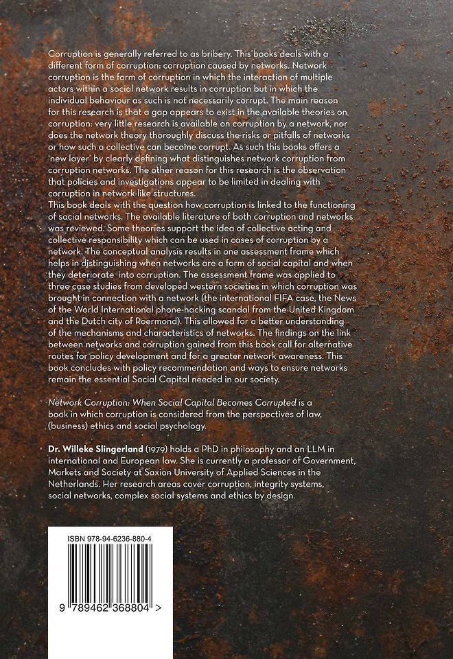 This book deals with the question how corruption is linked to the functioning of social networks. The available literature of both corruption and networks was reviewed. Some theories support the idea of collective acting and collective responsibility which can be used in cases of corruption by a network. The conceptual analysis results in one assessment frame which helps in distinguishing when networks are a form of social capital and when they deteriorate into corruption. The assessment frame was applied to three case studies from developed western societies in which corruption was brought in connection with a network (the international FIFA case, the News of the World International phone-hacking scandal from the United Kingdom and the Dutch city of Roermond). This allowed for a better understanding of the mechanisms and characteristics of networks. The findings on the link between networks and corruption gained from this book call for alternative routes for policy development and for a greater network awareness. This book concludes with policy recommendation and ways to ensure networks remain the essential Social Capital needed in our society.