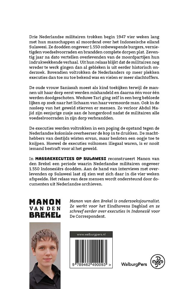 In Massaexecuties op Sulawesi reconstrueert Manon van den Brekel een periode waarin Nederlandse militairen ongeveer 1.550 Indonesiërs doodden. Aan de hand van interviews met overlevenden op Sulawesi laat zij zien wat zich daar in die vier weken afspeelde. Het relaas van deze mensen wordt ondersteund door documenten uit Nederlandse archieven.