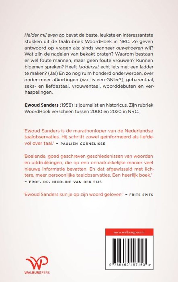 'Helder mij even op' bevat de beste, leukste en interessantste stukken uit de taalrubriek WoordHoek in NRC. Ze geven antwoord op vragen als: sinds wanneer ouwehoeren wij? Wat zijn de nadelen van bekakt praten? Waarom bestaan er wel foute mannen, maar geen foute vrouwen? Kunnen bloemen spreken? Heeft ladderzat echt iets met een ladder te maken? (Ja!). En zo nog ruim honderd onderwerpen, over onder meer afkortingen (wat is een GN’er?), gebarentaal, seks- en liefdestaal, vrouwentaal, woorddebuten en verhaspelingen.