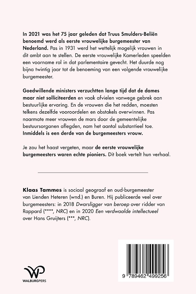 Goedwillende ministers verzuchtten lange tijd dat de dames maar niet solliciteerden en vaak afvielen vanwege gebrek aan bestuurlijke ervaring. En de vrouwen die het redden, moesten telkens dezelfde vooroordelen en obstakels overwinnen. Pas naarmate meer vrouwen de mars door de gemeentelijke bestuursorganen aflegden, nam het aantal substantieel toe. Inmiddels is een derde van de burgemeesters vrouw. Je zou het haast vergeten, maar de eerste vrouwelijke burgemeesters waren echte pioniers. Dit boek vertelt hun verhaal.