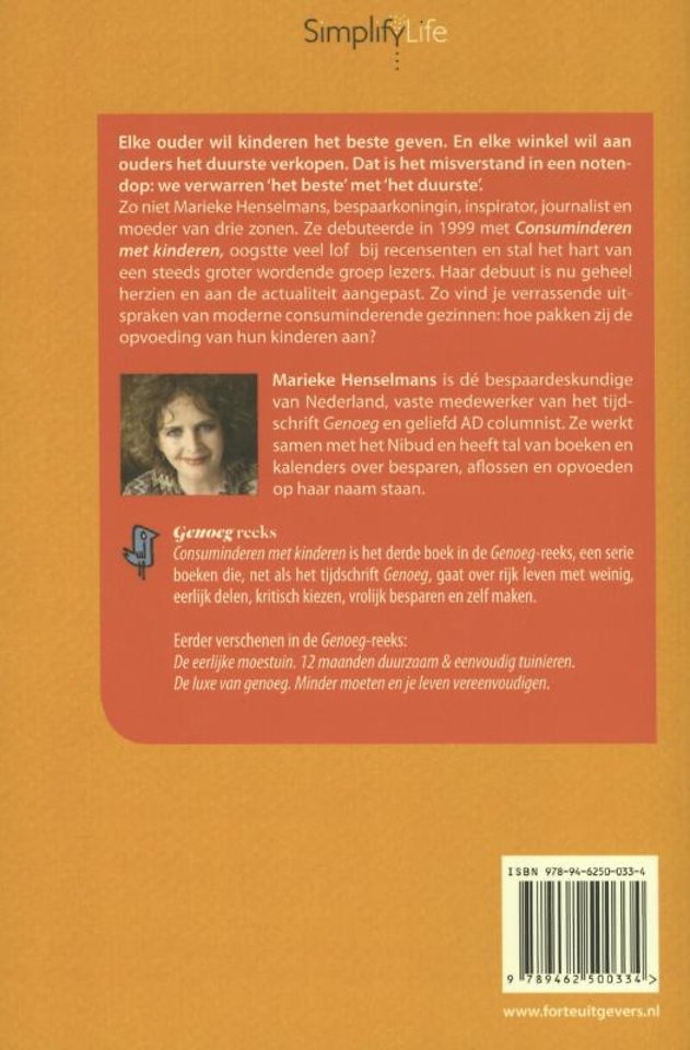Elke ouder wil kinderen het best geven. En elke winkel wil aan (aanstaande en andere) ouders het duurste verkopen. Dat is het misverstand in een notendop: we verwarren 'het beste' met 'het duurste'. Zo niet Marieke Henselmans, bespaarkoningin, inspirator, journalist en moeder van 3 zonen. Ze debuteerde in 1999 met Consuminderen met kinderen, oogstte veel lof bij recensenten en stal het hart van een steeds groter wordende groep lezers. Haar debuut is nu geheel herzien en aan de actualiteit aangepast. Zo vind je verrassende uitspraken van moderne consuminderende gezinnen: hoe pakken zij anno 2014 de opvoeding van hun kinderen aan?