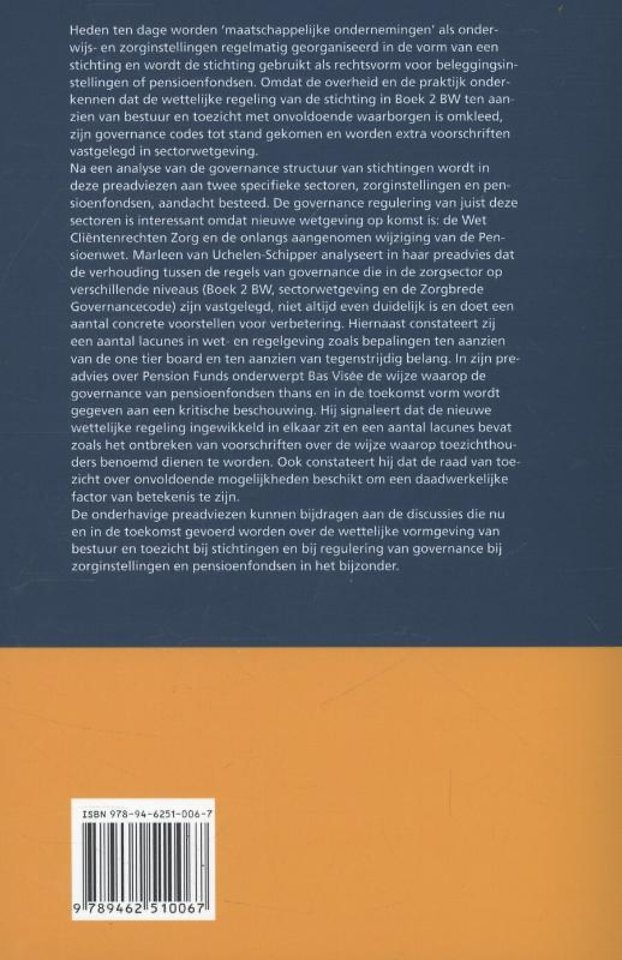 Na een analyse van de governance structuur van stichtingen wordt in deze preadviezen aan twee specifieke sectoren, zorginstellingen en pensioenfondsen, aandacht besteed. De governance regulering van juist deze sectoren is interessant omdat nieuwe wetgeving op komst is: de Wet Cliëntenrechten Zorg en de onlangs aangenomen wijziging van de Pensioenwet.