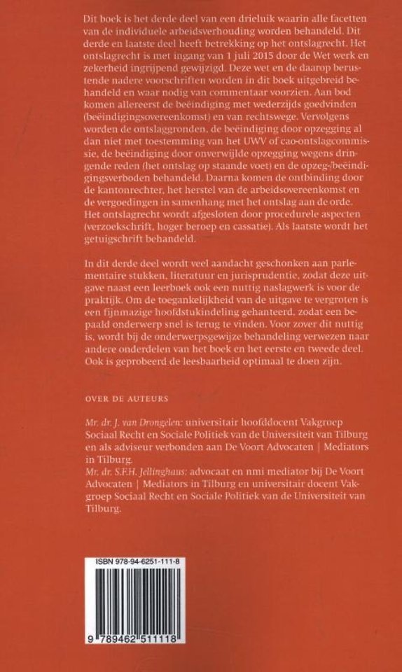 Dit boek is het derde deel van een drieluik waarin alle facetten van de individuele arbeidsverhouding worden behandeld. Dit derde en laatste deel heeft betrekking op het ontslagrecht. Het ontslagrecht is met ingang van 1 juli 2015 door de Wet werk en zekerheid ingrijpend gewijzigd. Deze wet en de daarop berustende nadere voorschriften worden in dit boek uitgebreid behandeld en waar nodig van commentaar voorzien. Aan bod komen allereerst de beëindiging met wederzijds goedvinden (beëindigingsovereenkomst) en van rechtswege.