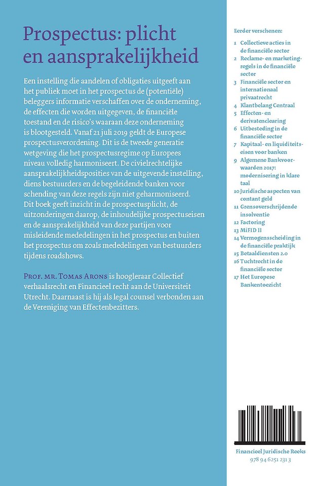 Dit boek geeft inzicht in de prospectusplicht, de uitzonderingen daarop, de inhoudelijke prospectuseisen en de aansprakelijkheid van deze partijen voor misleidende mededelingen in het prospectus en buiten het prospectus om zoals mededelingen van bestuurders tijdens roadshows.