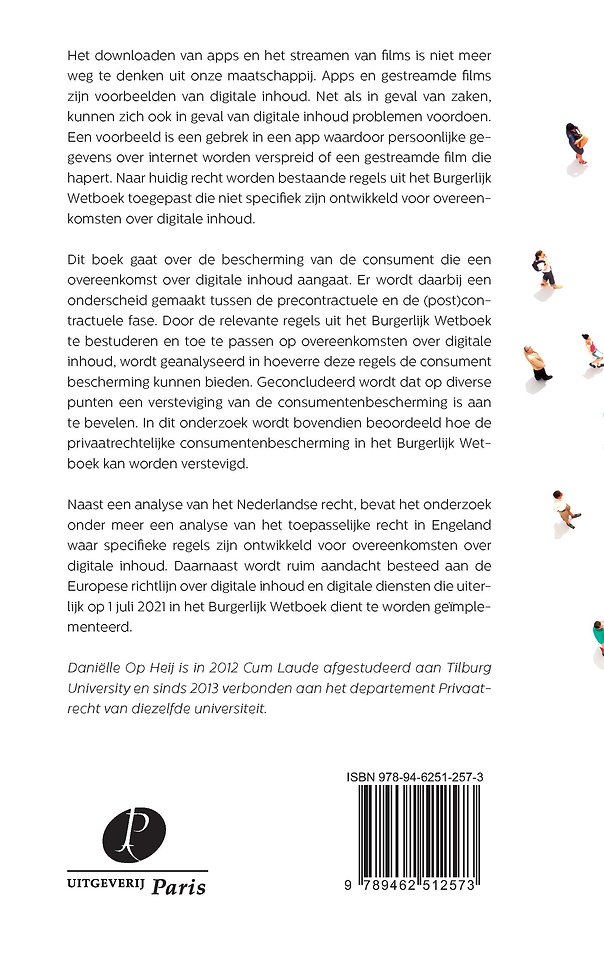 Dit boek gaat over de bescherming van de consument die een overeenkomst over digitale inhoud aangaat. Er wordt daarbij een onderscheid gemaakt tussen de precontractuele en de (post)contractuele fase. Door de relevante regels uit het Burgerlijk Wetboek te bestuderen en toe te passen op overeenkomsten over digitale inhoud, wordt geanalyseerd in hoeverre deze regels de consument bescherming kunnen bieden. Geconcludeerd wordt dat op diverse punten een versteviging van de consumentenbescherming is aan te bevelen. In dit onderzoek wordt bovendien beoordeeld hoe de privaatrechtelijke consumentenbescherming in het Burgerlijk Wetboek kan worden verstevigd.