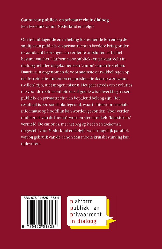 Om het uitdagende en in belang toenemende terrein op de snijlijn van publiek- en privaatrecht in bredere kring onder de aandacht te brengen en verder te ontsluiten, is bij het bestuur van het Platform voor publiek- en privaatrecht in dialoog het idee opgekomen een ‘canon’ samen te stellen. Daarin zijn opgenomen de voornaamste ontwikkelingen op dat terrein, die studenten en juristen die daarop werkzaam (willen) zijn, niet mogen missen.