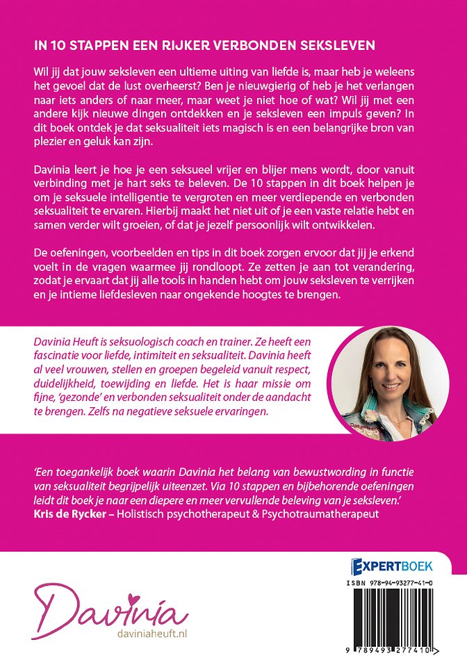 Davinia leert je hoe je een seksueel vrijer en blijer mens wordt, door vanuit verbinding met je hart seks te beleven. De 10 stappen in dit boek helpen je om je seksuele intelligentie te vergroten en meer verdiepende en verbonden seksualiteit te ervaren. Hierbij maakt het niet uit of je een vaste relatie hebt en samen verder wilt groeien, of dat je jezelf persoonlijk wilt ontwikkelen.