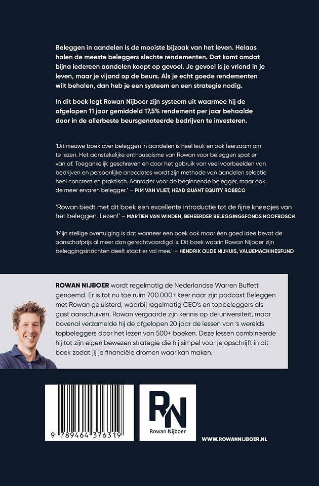 In dit boek legt Rowan Nijboer zijn systeem uit waarmee hij de afgelopen 11 jaar gemiddeld 17,5% rendement per jaar behaalde door in de allerbeste beursgenoteerde bedrijven te investeren.