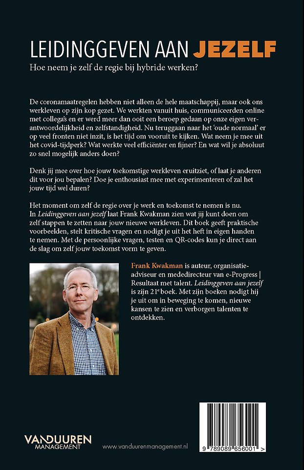 Meer over Frank KwakmanDe coronamaatregelen hebben niet alleen de hele maatschappij, maar ook ons werkleven op zijn kop gezet. We werkten vanuit huis, communiceerden online met collega’s en er werd meer dan ooit een beroep gedaan op onze eigen verantwoordelijkheid en zelfstandigheid. Nu teruggaan naar het ‘oude normaal’ er op veel fronten niet inzit, is het tijd om vooruit te kijken. Wat neem je mee uit het covid-tijdperk? Wat werkte veel efficiënter en fijner? En wat wil je absoluut zo snel mogelijk anders doen?