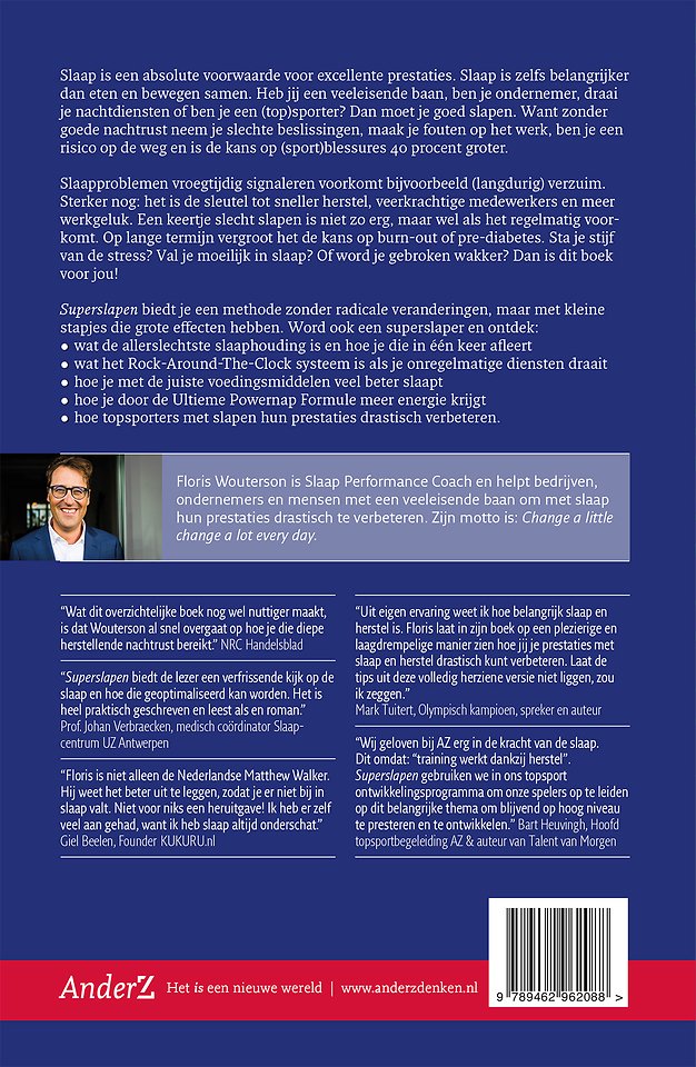 Meer over Floris WoutersonSlaap is een absolute voorwaarde voor excellente prestaties. Slaap is zelfs belangrijker dan eten en bewegen samen. Heb jij een veeleisende baan, ben je ondernemer, draai je nachtdiensten of ben je een (top)sporter? Dan moet je goed slapen. Want zonder goede nachtrust neem je slechte beslissingen, maak je fouten op het werk, ben je een risico op de weg en is de kans op (sport)blessures 40 procent groter.