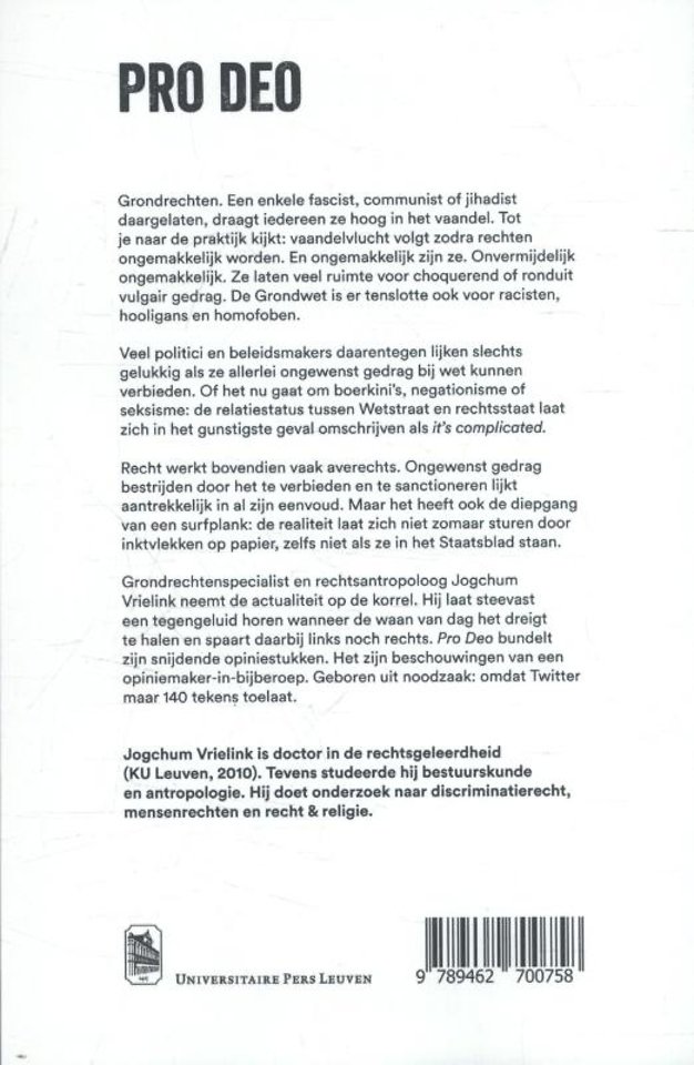 Grondrechtenspecialist en rechtsantropoloog Jogchum Vrielink neemt de actualiteit op de korrel. Hij laat steevast een tegengeluid horen wanneer de waan van dag het dreigt te halen en spaart daarbij links noch rechts. 'Pro Deo' bundelt zijn snijdende opiniestukken. Het zijn beschouwingen van een opiniemaker-in-bijberoep. Geboren uit noodzaak: omdat Twitter maar 140 tekens toelaat.
