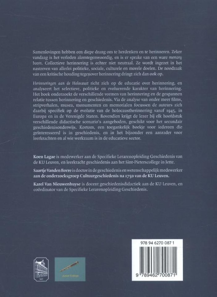 Herinneringen aan de Holocaust richt zich op de educatie over herinnering, en analyseert het selectieve, politieke en evoluerende karakter van herinnering. Het boek onderzoekt de verschillende vormen van herinnering en de gespannen relatie tussen herinnering en geschiedenis. Via de analyse van onder meer films, stripverhalen, musea, monumenten en memorialen focussen de auteurs zich daarbij specifiek op de evolutie van de holocaustherinnering vanaf 1945, in Europa en in de Verenigde Staten. Bovendien krijgt de lezer bij elk hoofdstuk verschillende didactische scenario's aangeboden, geschikt voor het secundair geschiedenisonderwijs. Kortom, een toegankelijk boekje voor iedereen die geïnteresseerd is in geschiedenis, en in het bijzonder een aanrader voor leerkrachten en al wie werkzaam is in de educatieve sector.