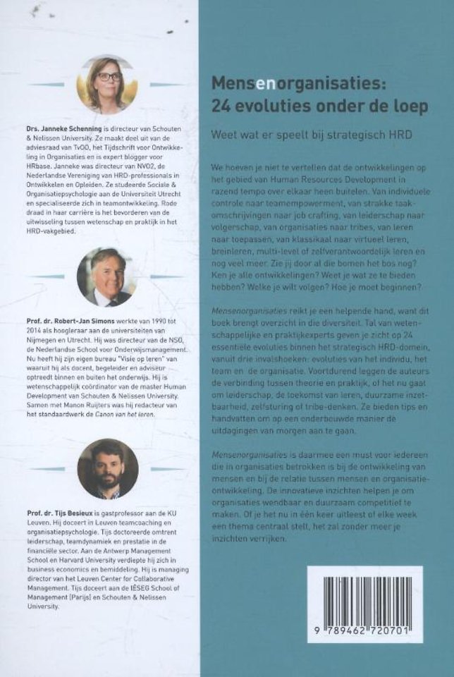 'Mensenorganisaties' reikt je de helpende hand, want dit boek brengt overzicht in die diversiteit. Tal van wetenschappelijke en praktijkexperts geven je zicht op 24 essentiële evoluties binnen het strategische HRD-domein, vanuit drie invalshoeken: evoluties van het individu, het team en de organisatie. Voortdurend leggen de auteurs de verbinding tussen theorie en praktijk, of het nu gaat om leiderschap, de toekomst van leren, duurzame inzetbaarheid, zelfsturing of tribe-denken. Ze bieden tips en handvatten om op een onderbouwde manier de uitdagingen van morgen aan te gaan.