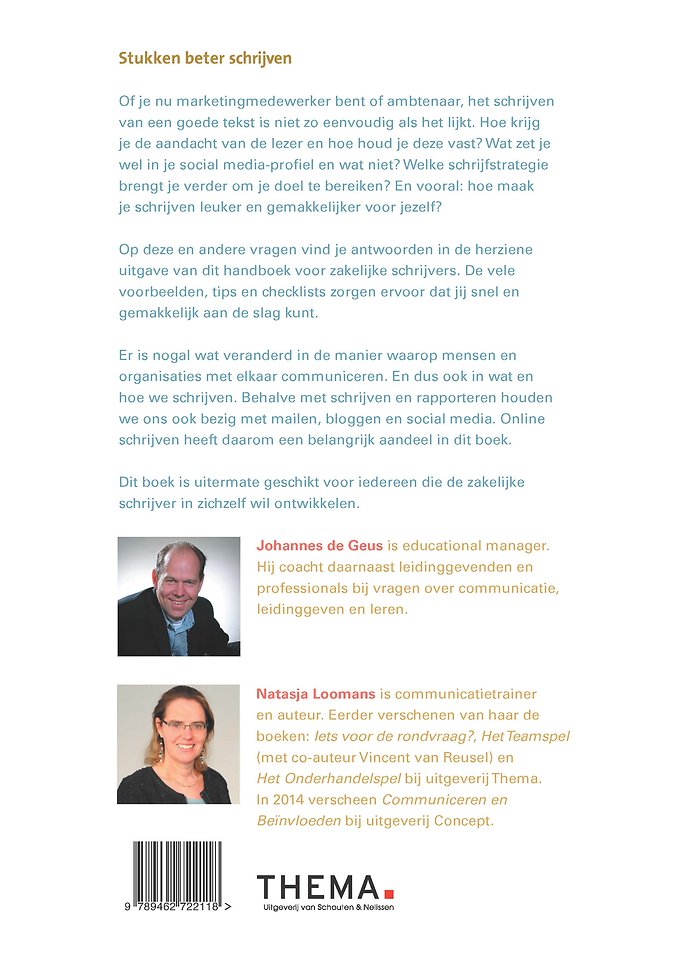 Dit al jaren goedverkopende boek bestaat uit drie delen. Deel 1 staat stil bij het schrijven zelf en gaat in op schrijfstrategieën, het doel van schrijven en het schrijfproces. Deel 2 behandelt de stukken: brieven, notulen, memo's verslagen of rapporten, alles komt aan bod. Je vindt overzichtelijke voorbeelden, checklists en tips om deze stukken te verbeteren. Deel 3 gaat over veelgebruikte social media als LinkedIn, Facebook en Twitter.
