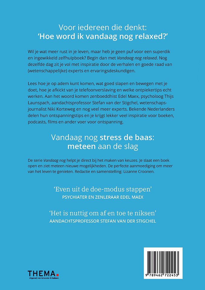 Wil je omgaan met de hectiek en drukte van alledag, maar heb je geen zin om een superdik en ingewikkeld zelfhulpboek te lezen? Begin dan met Vandaag nog relaxed en ontdek hoe je direct rust kunt aanbrengen in je leven.