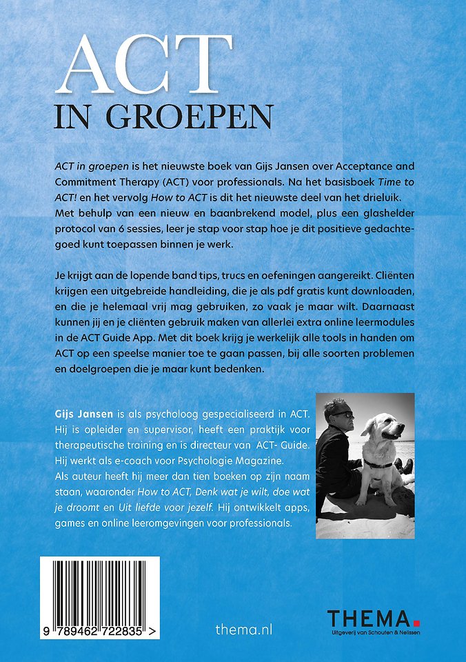 Meer over Gijs Jansen'ACT in groepen' is het nieuwste boek van Gijs Jansen over Acceptance and Commitment Therapy (ACT) voor professionals. Na het basisboek 'Time to ACT!' en het vervolg 'How to ACT' is dit het nieuwste deel van het drieluik.